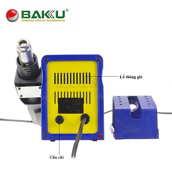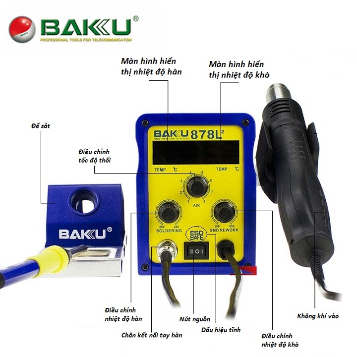 2. Khi hoạt động, Mákhò và hàBAKU-878L  sẽ báo hiệu bằng đèn-tại mỗi tính năng để bạn có thể biết chính xác chức năng nào đang hoạt động (VD: Đèn báo gió, đèn báo nhiệt); Gió tỏa ra từ đầu khò đều khiến việc xử lý các chi tiết trên bảng mạch chính xác hơn